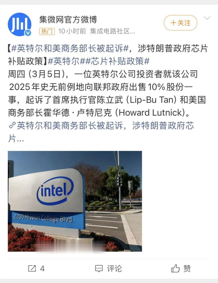3月8日,彭博社袒露的一则诉讼犹如一颗石子插足本就海潮挪动的半导体湖面:英特尔鼓励理查德·佩斯纳细致告状英特尔CEO陈立武、好意思国商务部长霍华德·卢特尼克及好意思国商务部炒股配资最新信息,指控旧年那笔让好意思国政府捏有英特尔约10%股权的来去,实质上是一场“廉价贱卖”。